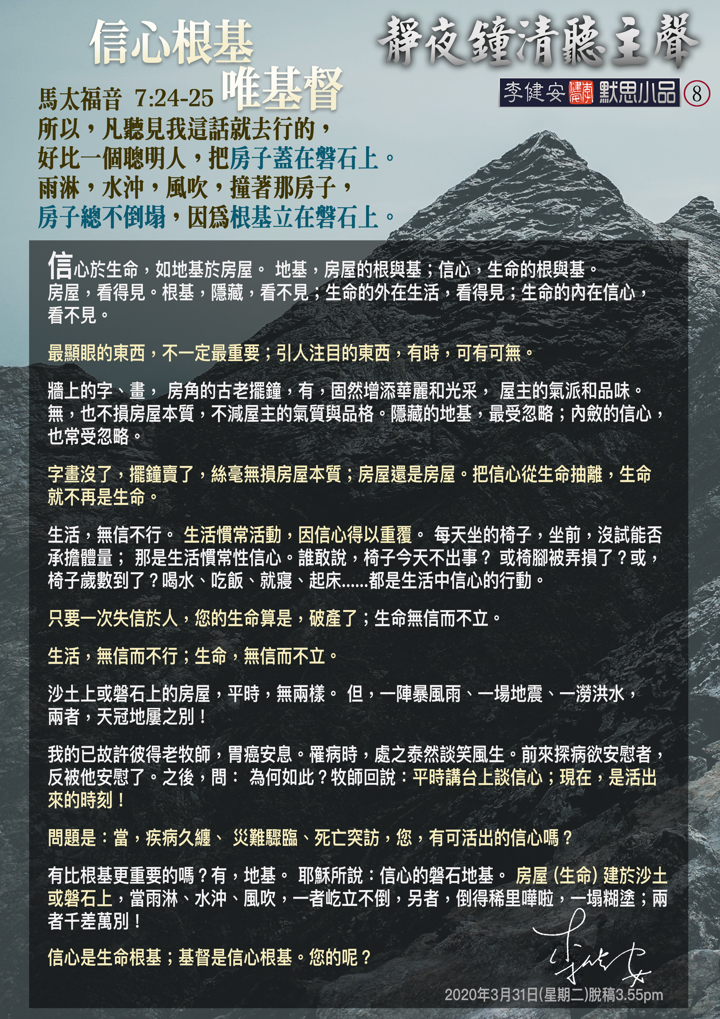生命的根基是信心:生命無信不立;生活無信不行。但,信心的根基是基督!不立在基督磐石上的生命,經不起:雨淋、水沖、風吹;災難是最真實、冷酷的試金石。