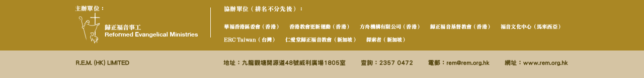 | 講員簡介:現任福音文化中心總幹事;美國西敏神學院(Westminster Theological Seminary)哲學博士;前馬來西亞聖經神學院院長。為當今西敏神學院最具影響力的幾位華人校友之一。包括REM特約講師曾劭愷在內,李牧師從事神學教育以來所教導過的年輕華人牧者、神學生難以數計。他多年在REM開設系統神學主題課程,諸如「人論.罪論」、「救贖論」、「聖靈論」、「教會論」、「末世論」等。李牧師近年來更致於突破傳統神學教育的瓶頸,以歸正神學為基礎推動福音文化事工,探討「從聖經看基督徒的公民社會責任」等議題。 |
